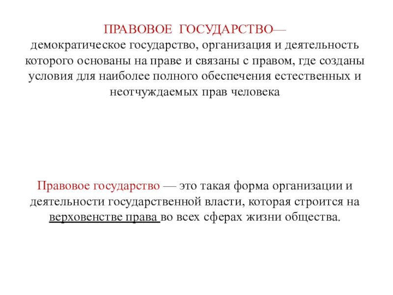 Правовое государство — это такая форма организации и деятельности государственной власти, которая строится на верховенстве права во всех сферах жизни общества.