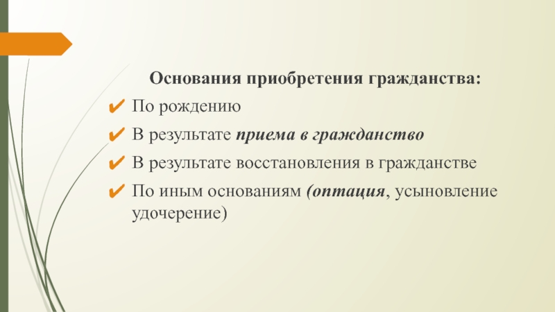 Основания приобретения гражданства:По рождениюВ результате приема в гражданствоВ результате восстановления в гражданствеПо иным основаниям (оптация, усыновление удочерение)