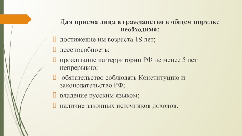 Для приема лица в гражданство в общем порядке необходимо:достижение им возраста 18 лет;дееспособность;проживание на территории РФ не