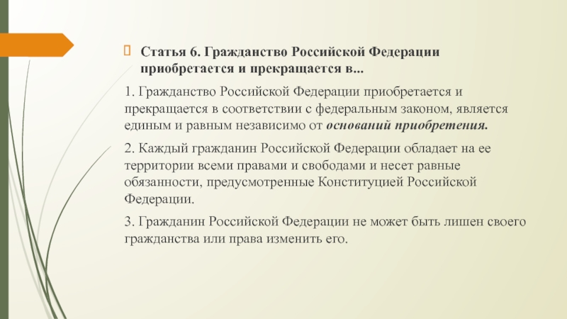 Слайд 3Статья 6. Гражданство Российской Федерации приобретается и прекращается в...