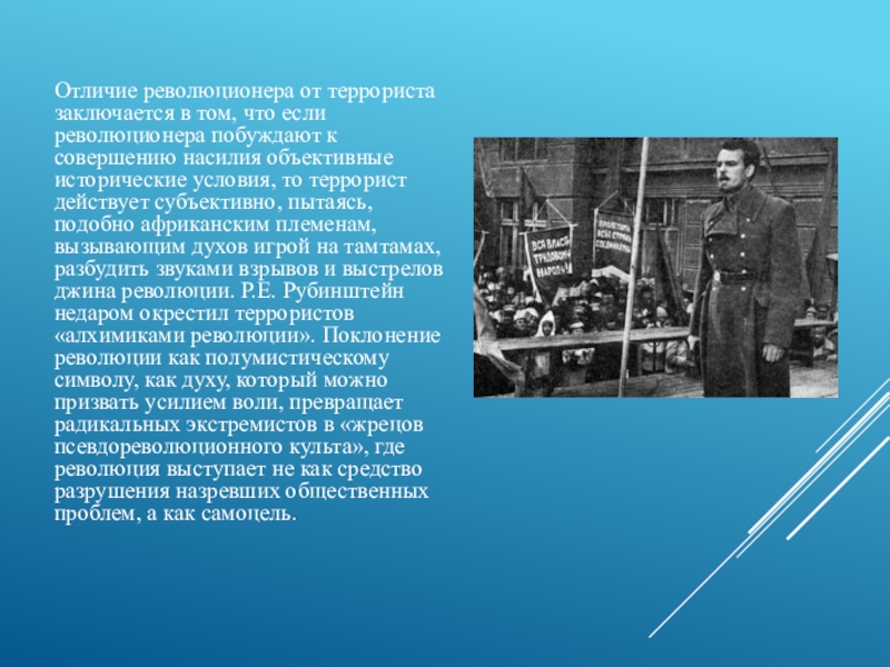 Слайд 9Отличие революционера от террориста заключается в том, что если революционера побуждают