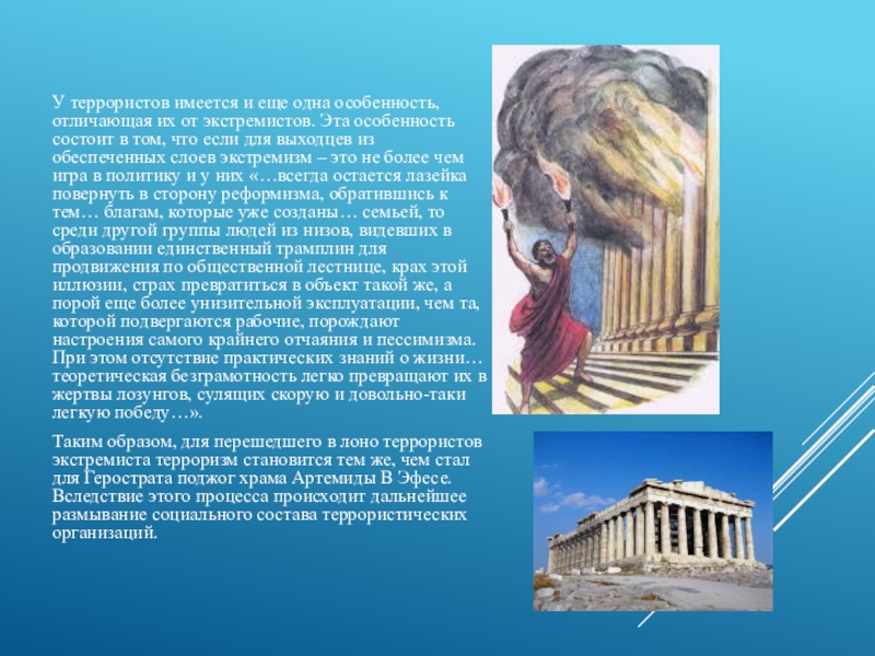 Таким образом, для перешедшего в лоно террористов экстремиста терроризм становится тем же, чем стал для Герострата поджог храма Артемиды В Эфесе. Вследствие этого процесса происходит дальнейшее размывание социального состава террористических организаций.