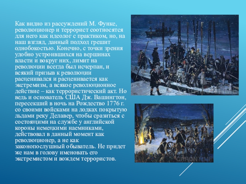 него как идеолог с практиком, но, на наш взгляд, данный подход грешит однобокостью. Конечно, с точки зрения удобно устроившихся на вершинах власти и вокруг них, лимит на революции всегда был исчерпан, и всякий призыв к революции расценивался и расценивается как экстремизм, а всякое революционное действие – как террористический акт. Но ведь и основатель США Дж. Вашингтон, пересекший в ночь на Рождество 1776 г. со своими войсками на лодках покрытую льдами реку Делавер, чтобы сразиться с состоящими на службе у английской короны немецкими наемниками, действовал в данный момент как революционер, а не как законопослушный обыватель. Не придет же нам в голову именовать его экстремистом и вождем террористов.