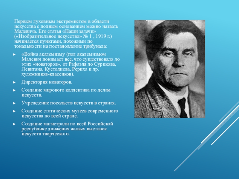 Малевича. Его статья «Наши задачи» («Изобразительное искусство» № 1 , 1919 г.) начинается пунктами, похожими по тональности на постановление трибунала: