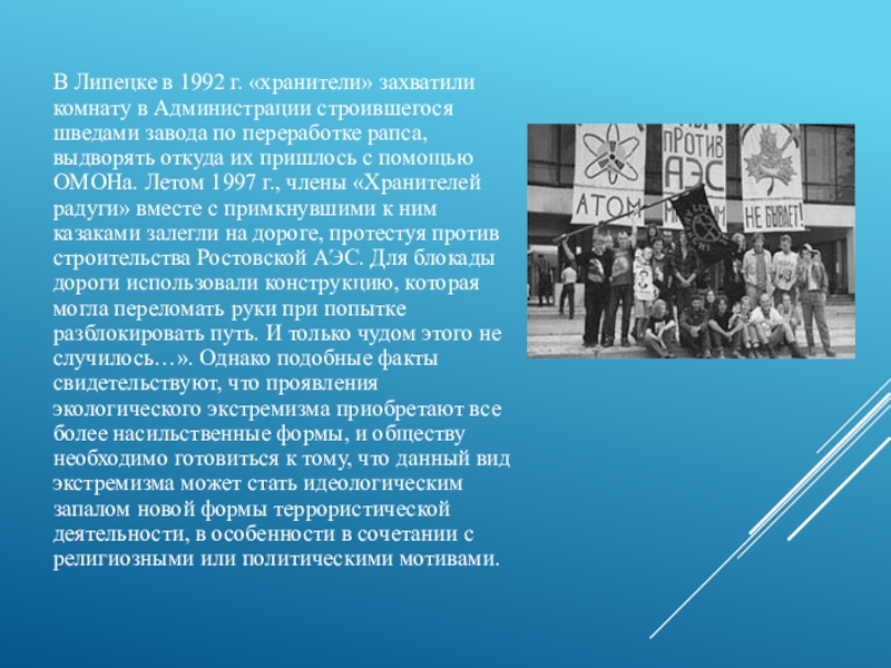 шведами завода по переработке рапса, выдворять откуда их пришлось с помощью ОМОНа. Летом 1997 г., члены «Хранителей радуги» вместе с примкнувшими к ним казаками залегли на дороге, протестуя против строительства Ростовской АЭС. Для блокады дороги использовали конструкцию, которая могла переломать руки при попытке разблокировать путь. И только чудом этого не случилось…». Однако подобные факты свидетельствуют, что проявления экологического экстремизма приобретают все более насильственные формы, и обществу необходимо готовиться к тому, что данный вид экстремизма может стать идеологическим запалом новой формы террористической деятельности, в особенности в сочетании с религиозными или политическими мотивами.