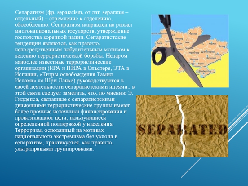отделению, обособлению. Сепаратизм направлен на развал многонациональных государств, утверждение господства коренной нации. Сепаратистские тенденции являются, как правило, непосредственным побудительным мотивом к ведению террористической борьбы. Недаром наиболее известные террористические организации (ИРА и ПИРА в Ольстере, ЭТА в Испании, «Тигры освобождения Тамил Ислама» на Шри Ланке) руководствуются в своей деятельности сепаратистскими идеями.. в этой связи следует заметить, что, по мнению Э. Гидденса, связанные с сепаратистскими движениями террористические группы имеют более прочные источники финансирования и провозглашают цели, пользующиеся определенной поддержкой у населения. Терроризм, основанный на мотивах национального экстремизма без уклона в сепаратизм, практикуется, как правило, ультраправыми группировками.