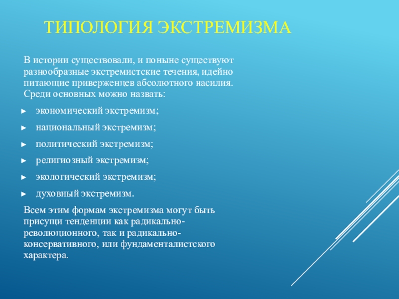 Слайд 10 ТИПОЛОГИЯ ЭКСТРЕМИЗМА