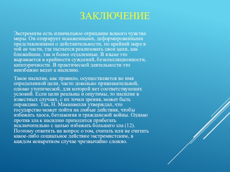 Такое насилие, как правило, осуществляется во имя определенной цели, часто довольно привлекательной, однако утопической, для которой нет соответствующих условий. Если цели реальны и ощутимы, то насилие в известных случаях, с их точки зрения, может быть оправдано. Так, Н. Макиавелли утверждал, что государство может пойти на любые действия, чтобы избежать хаоса, беззакония и гражданской войны. Однако против зла к насилию приходится прибегать исключительно с целью избежать большего зла (12). Поэтому ответить на вопрос о том, считать или не считать какое-либо социальное действие экстремистским, в каждом конкретном случае чрезвычайно сложно.