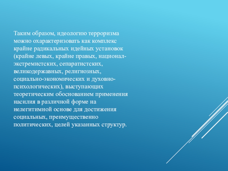 Слайд 27Таким образом, идеологию терроризма можно охарактеризовать как комплекс крайне радикальных идейных