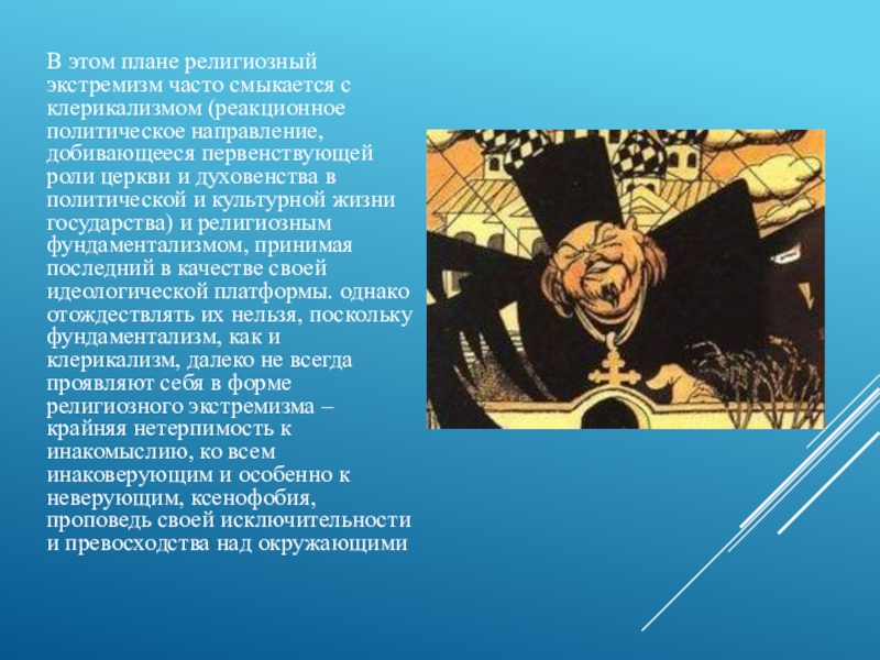 Слайд 17В этом плане религиозный экстремизм часто смыкается с клерикализмом (реакционное политическое