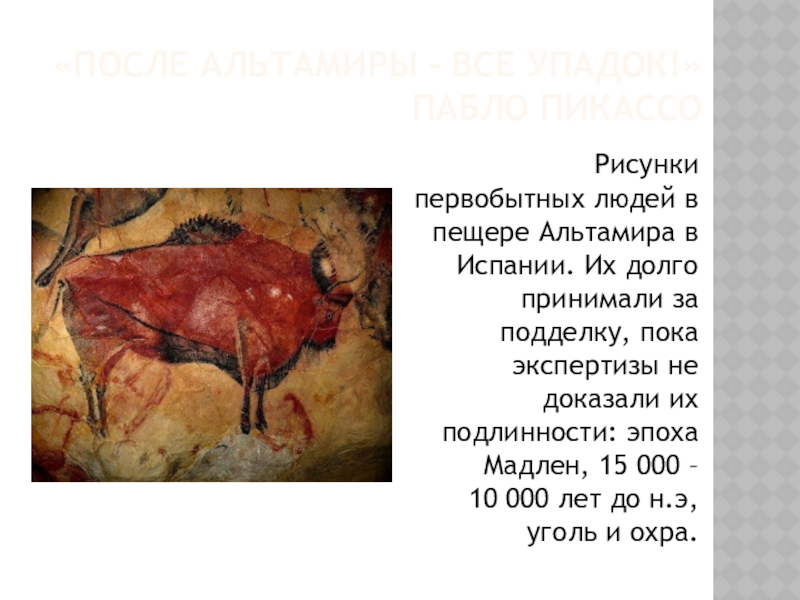 «ПОСЛЕ АЛЬТАМИРЫ – ВСЕ УПАДОК!»    ПАБЛО ПИКАССО  Рисунки первобытных людей в пещере Альтамира