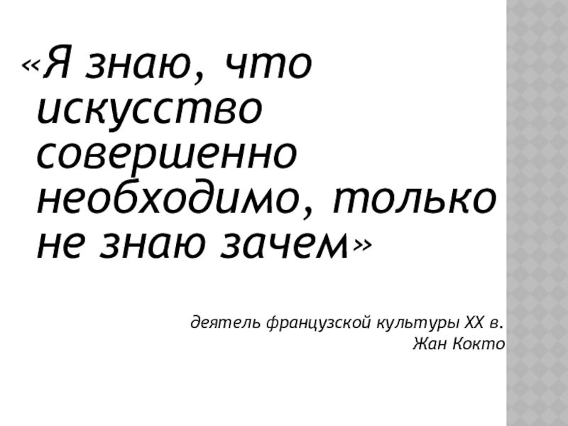 «Я знаю, что искусство совершенно необходимо, только не знаю зачем» деятель французской культуры XX в. Жан Кокто