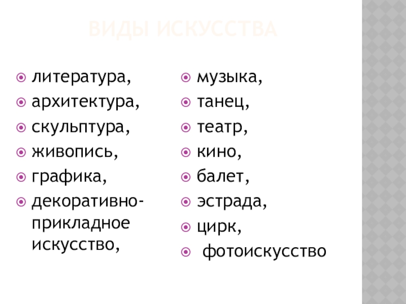 ВИДЫ ИСКУССТВАлитература, архитектура, скульптура, живопись, графика, декоративно-прикладное искусство, музыка, танец, театр, кино, балет, эстрада, цирк, фотоискусство
