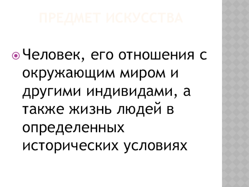 ПРЕДМЕТ ИСКУССТВА Человек, его отношения с окружающим миром и другими индивидами, а также жизнь людей в определенных