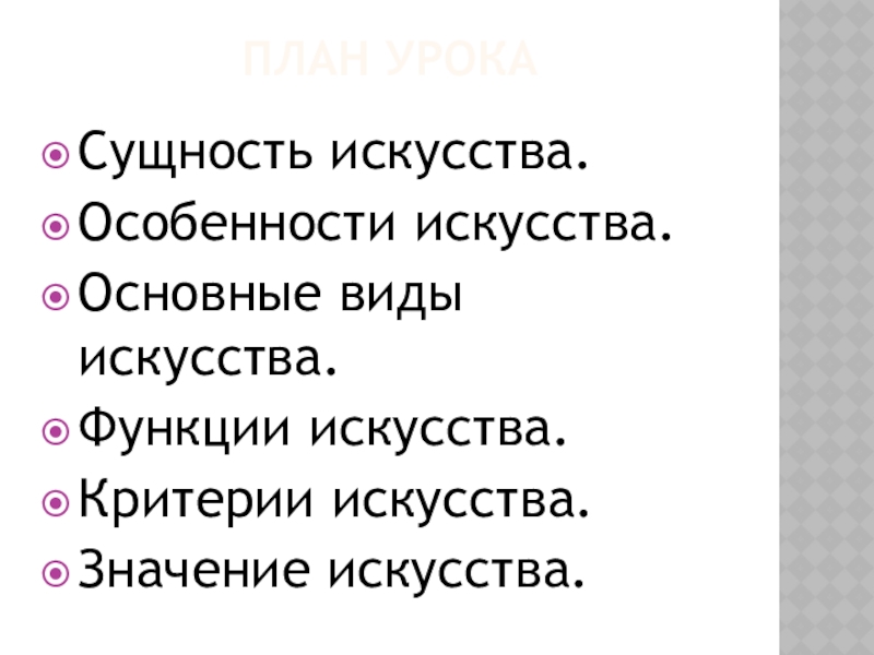 ПЛАН УРОКА Сущность искусства.Особенности искусства.Основные виды искусства.Функции искусства.Критерии искусства.Значение искусства.