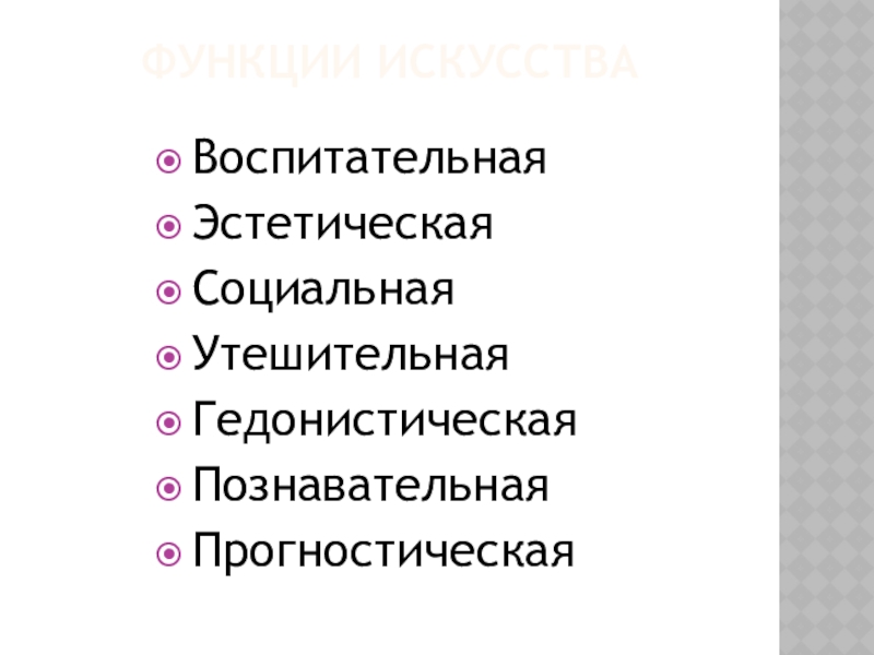 ФУНКЦИИ ИСКУССТВАВоспитательнаяЭстетическаяСоциальнаяУтешительнаяГедонистическаяПознавательнаяПрогностическая