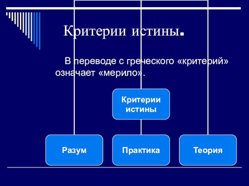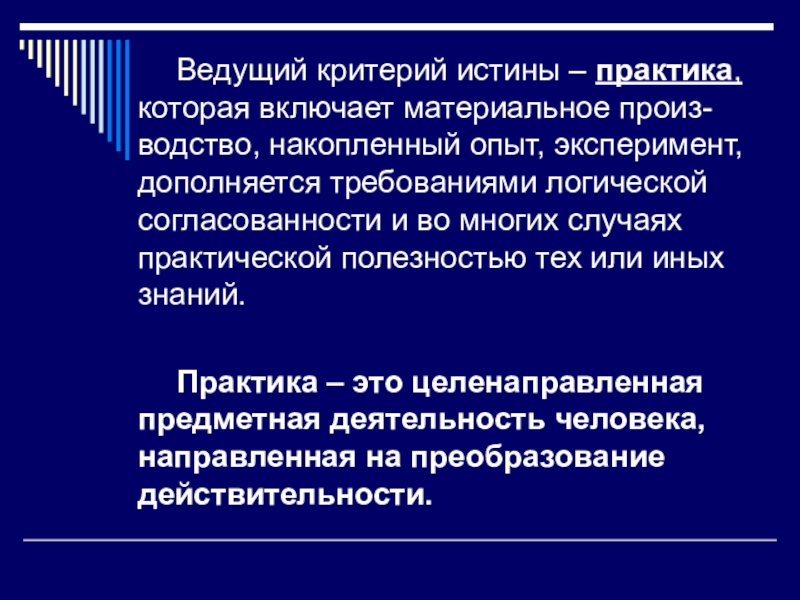 Слайд 11 Ведущий критерий истины – практика, которая включает
