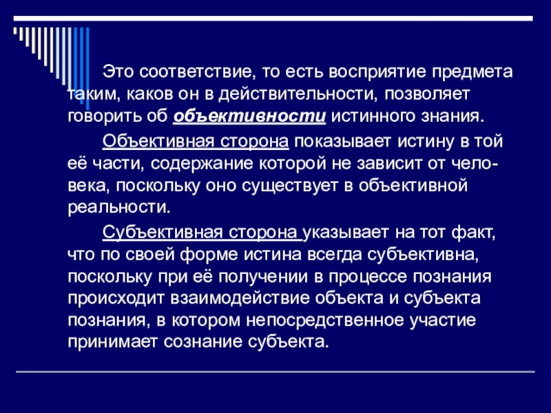 Это соответствие, то есть восприятие предмета таким, каков он в действительности, позволяет говорить об объективности истинного знания.