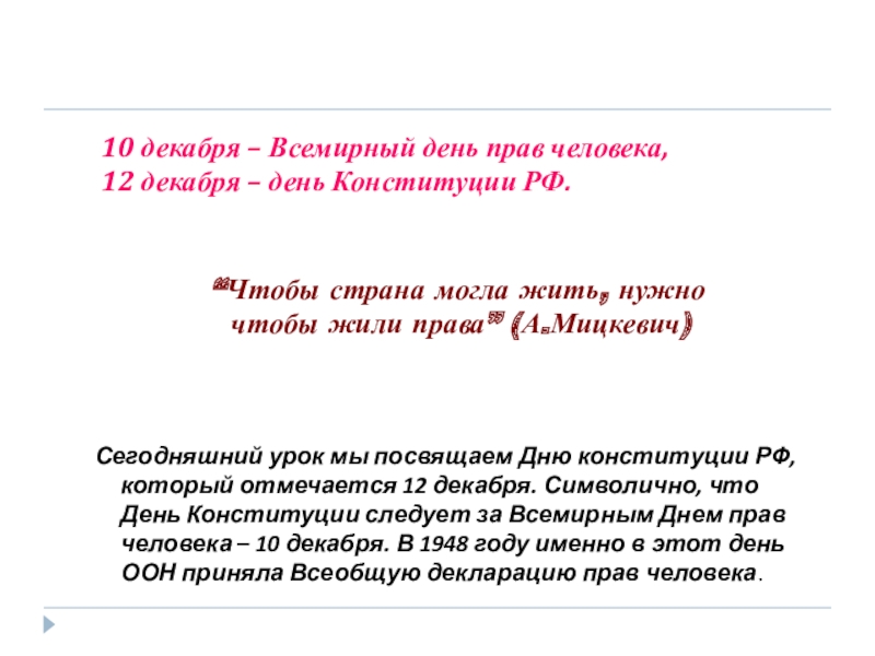 Сегодняшний урок мы посвящаем Дню конституции РФ, который отмечается 12 декабря. Символично, что День Конституции следует за Всемирным Днем прав человека – 10 декабря. В 1948 году именно в этот день ООН приняла Всеобщую декларацию прав человека.
