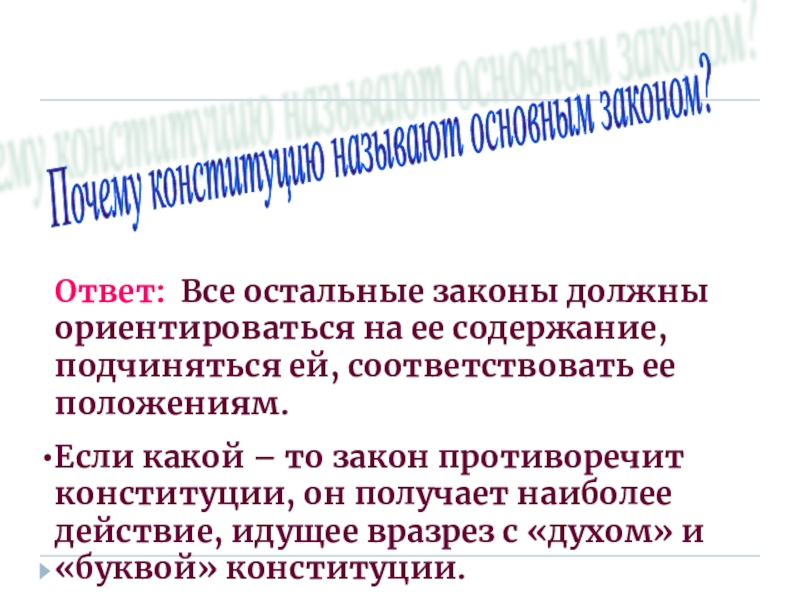 Она занимает первое место в иерархии законодательных и всех иных нормативных актов государства и является правовым и моральным камертоном. Приоритет Конституции - не самоцель данного документа, он обеспечивает единообразное применение Закона. В преамбуле и статьях Конституции содержатся нравственные ориентиры справедливости для нашего общества и государства.