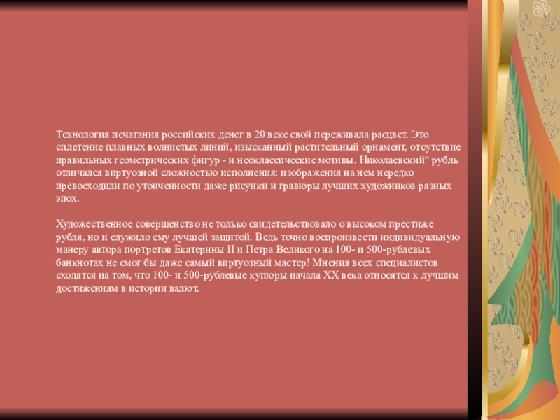 Слайд 16Технология печатания российских денег в 20 веке свой переживала расцвет. Это