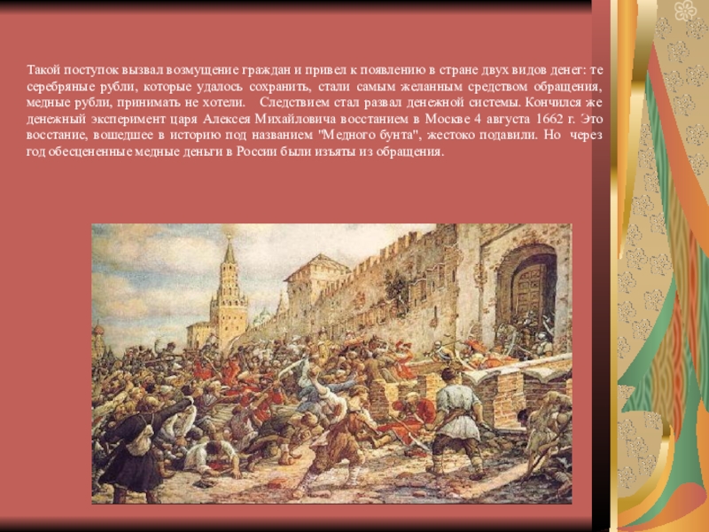 двух видов денег: те серебряные рубли, которые удалось сохранить, стали самым желанным средством обращения, медные рубли, принимать не хотели. Следствием стал развал денежной системы. Кончился же денежный эксперимент царя Алексея Михайловича восстанием в Москве 4 августа 1662 г. Это восстание, вошедшее в историю под названием "Медного бунта", жестоко подавили. Но через год обесцененные медные деньги в России были изъяты из обращения.
