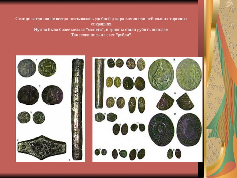Слайд 9На Руси монеты появились в Х веке, они чеканились из серебра