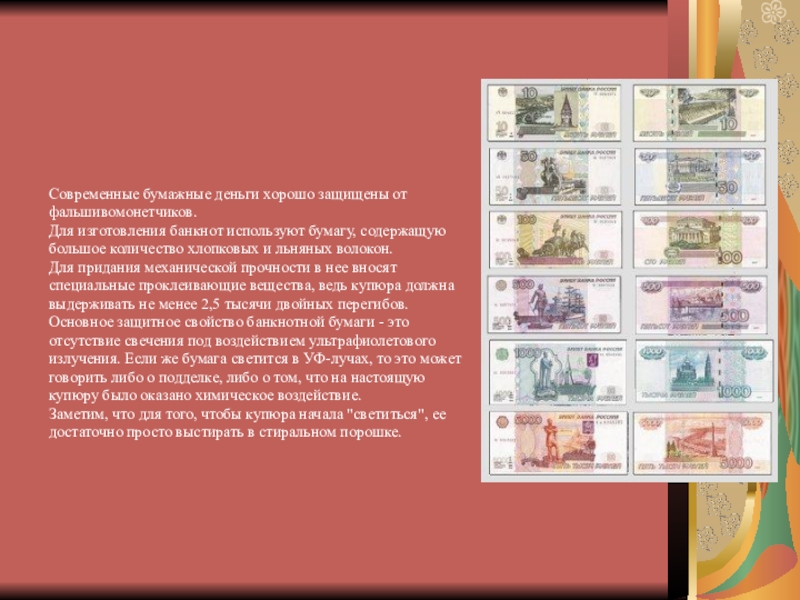 Слайд 23Современные бумажные деньги хорошо защищены от фальшивомонетчиков.