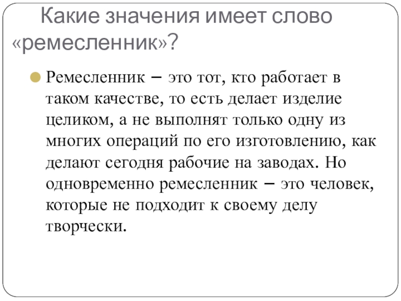Ремесленник – это тот, кто работает в таком качестве, то есть делает изделие целиком, а не выполнят только одну из многих операций по его изготовлению, как делают сегодня рабочие на заводах. Но одновременно ремесленник – это человек, которые не подходит к своему делу творчески.