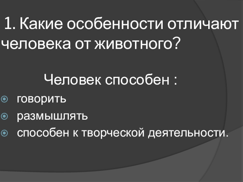Слайд 2 1. Какие особенности отличают человека от животного?