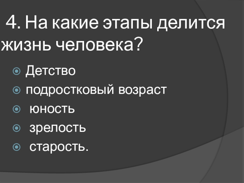 Слайд 8 4. На какие этапы делится жизнь человека?