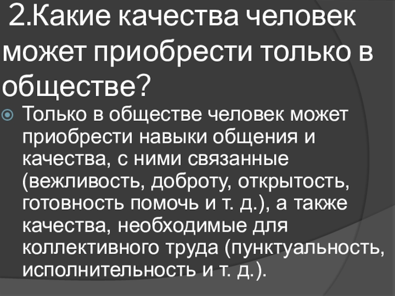 Слайд 4 2.Какие качества человек может приобрести только в обществе?