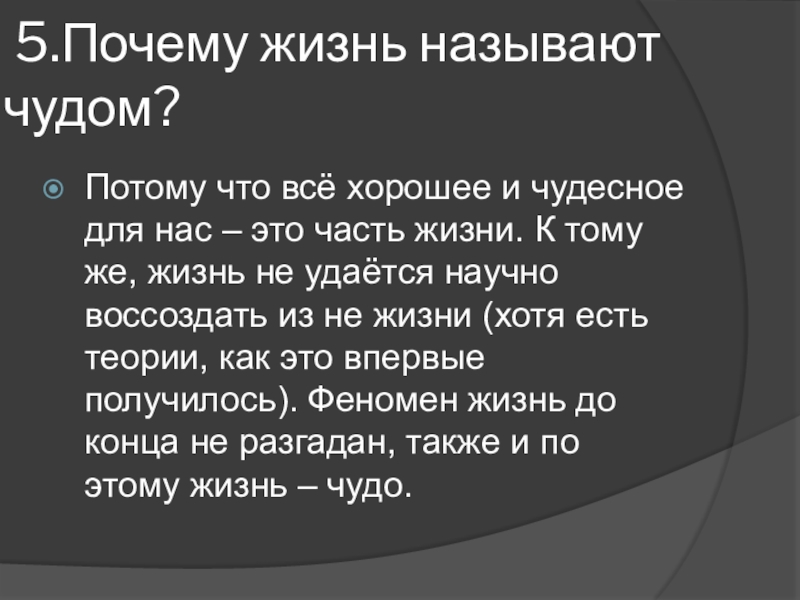 5.Почему жизнь называют чудом?Потому что всё хорошее и чудесное для нас – это часть жизни. К