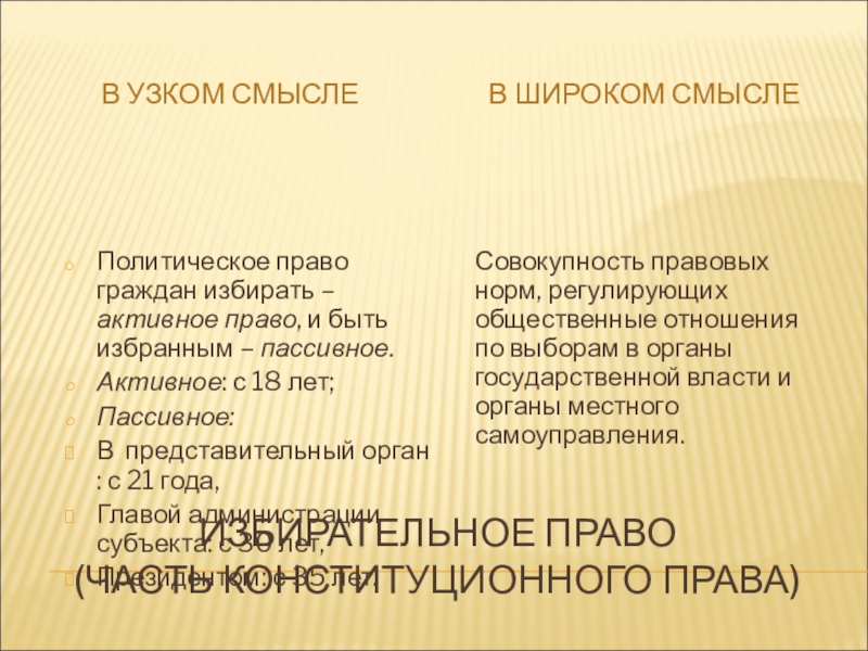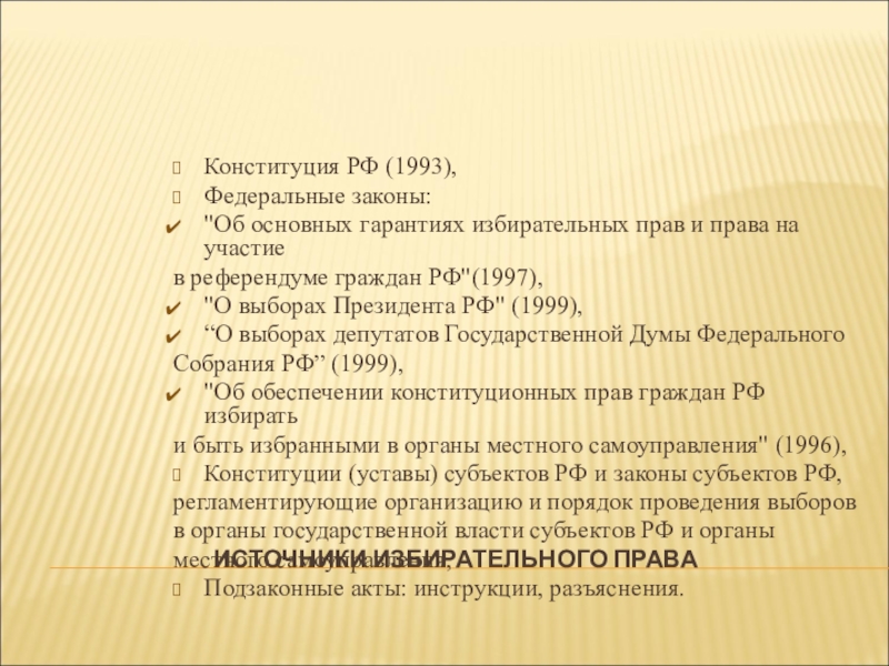 Совокупность правовых норм, регулирующих общественные отношения по выборам в органы государственной власти и органы местного самоуправления.