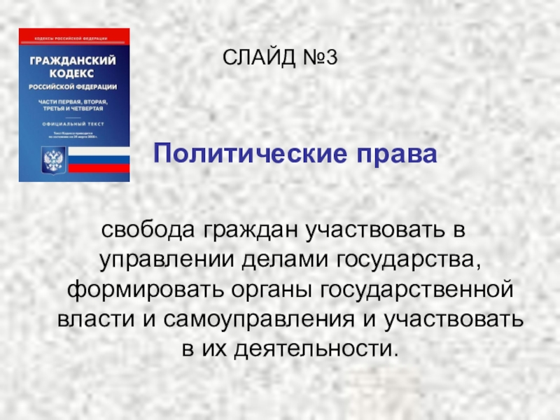 СЛАЙД №3   Политические права свобода граждан участвовать в управлении делами государства, формировать органы государственной власти