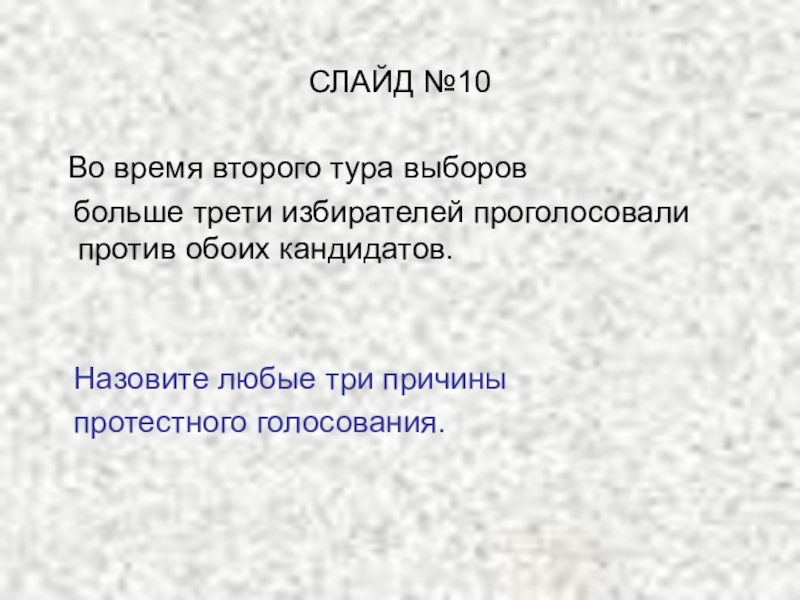 СЛАЙД №10  Во время второго тура выборов  больше трети избирателей проголосовали против обоих кандидатов.