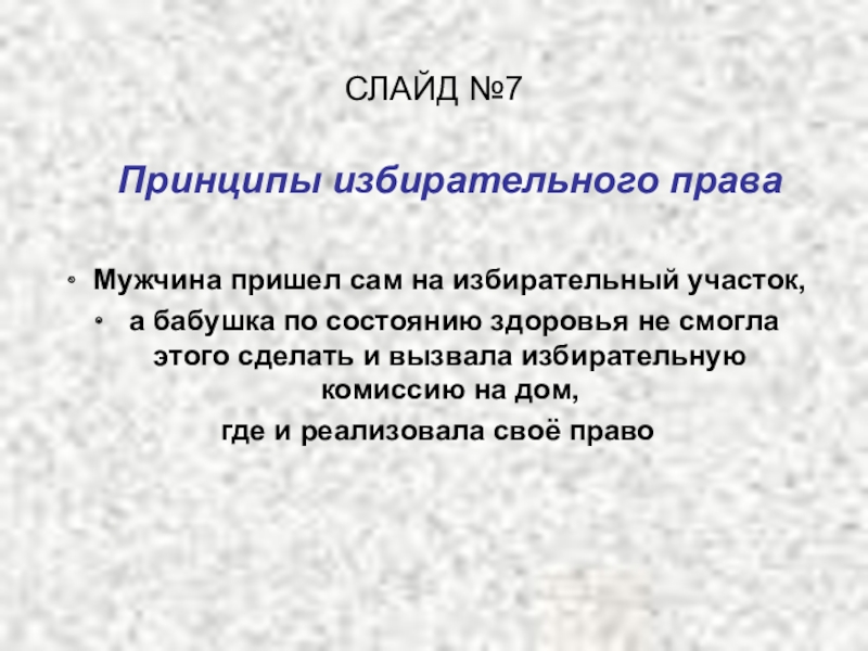 СЛАЙД №7  Принципы избирательного права Мужчина пришел сам на избирательный участок, а бабушка по состоянию здоровья