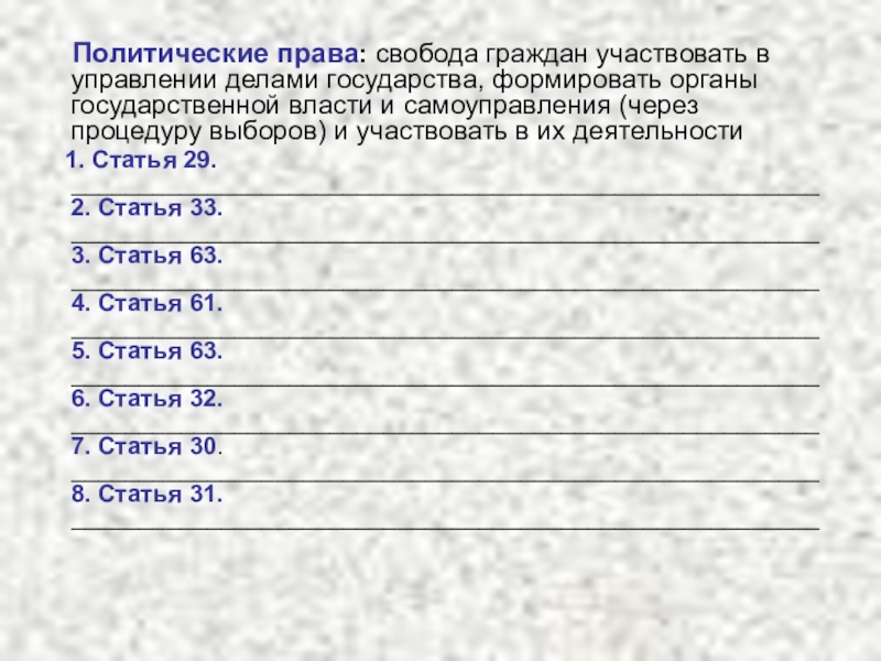 Политические права: свобода граждан участвовать в управлении делами государства, формировать органы государственной власти и