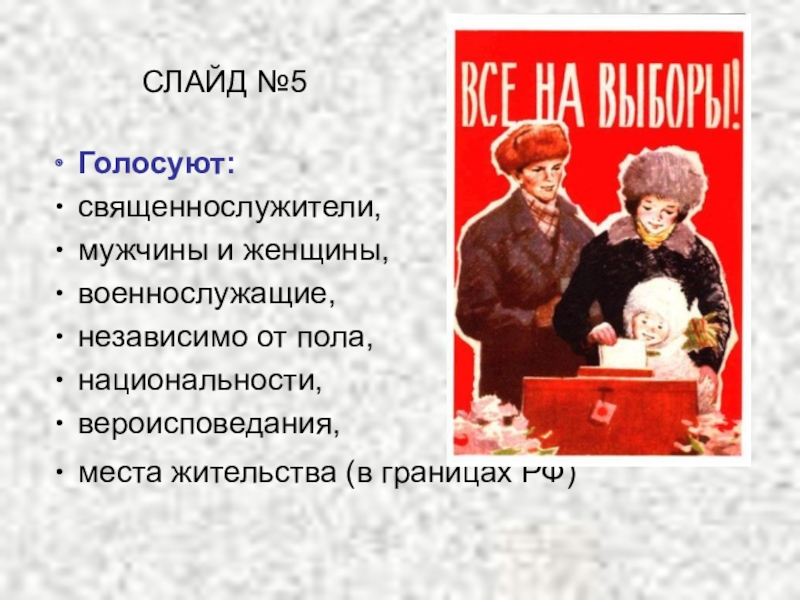 СЛАЙД №5 Голосуют: священнослужители,мужчины и женщины,военнослужащие,независимо от пола, национальности,вероисповедания, места жительства