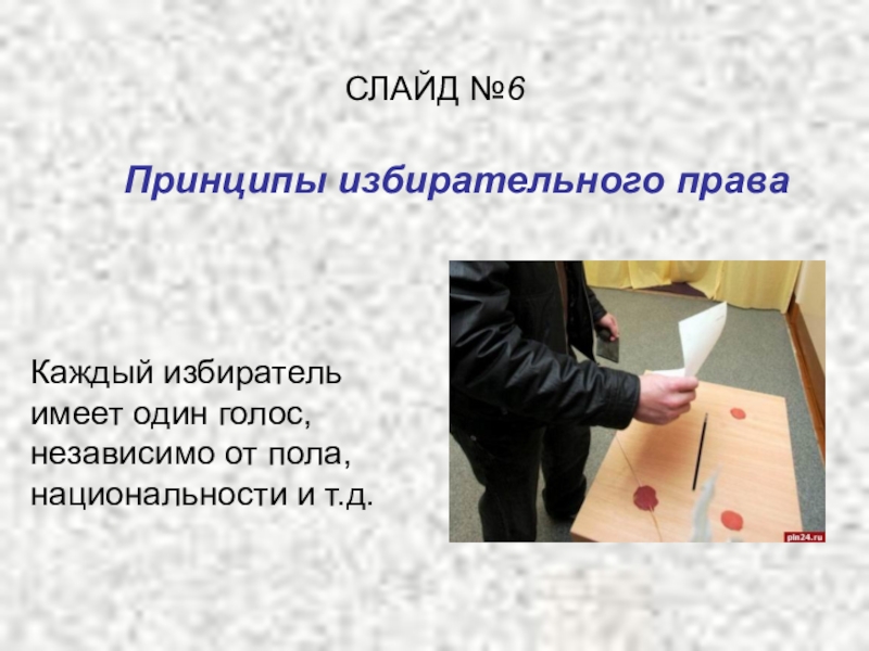 СЛАЙД №6   Принципы избирательного права Каждый избиратель имеет один голос, независимо от пола, национальности и
