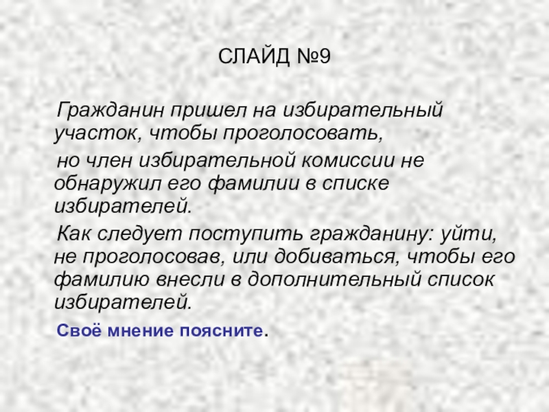 СЛАЙД №9   Гражданин пришел на избирательный участок, чтобы проголосовать,  но член избирательной комиссии не