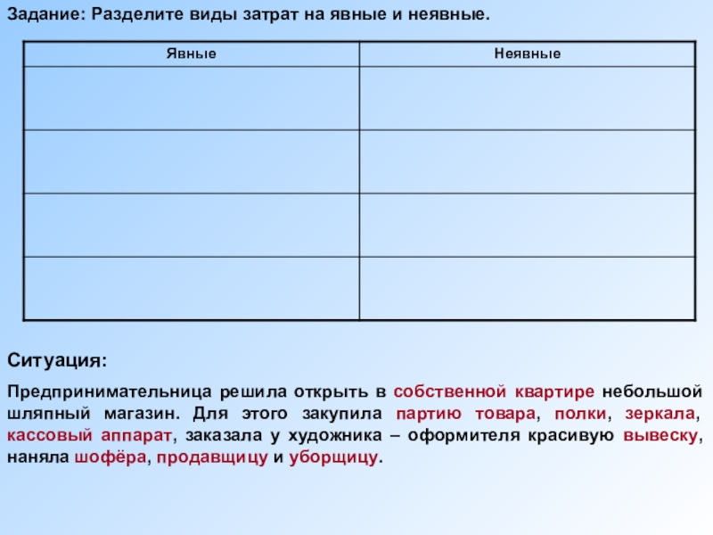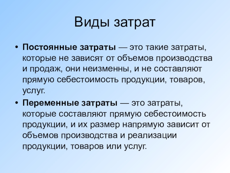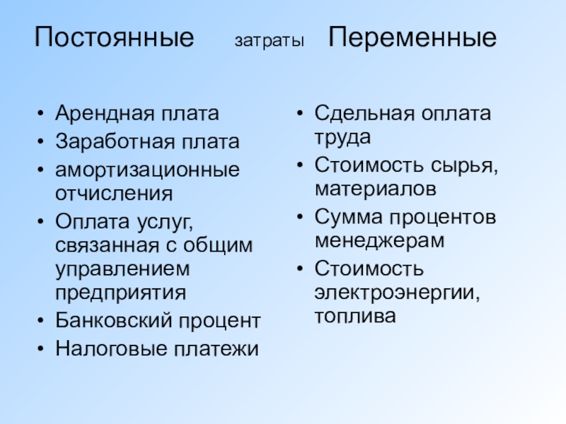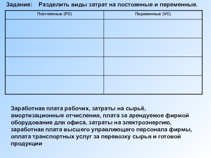 Задание: Разделить виды затрат на постоянные и переменные.