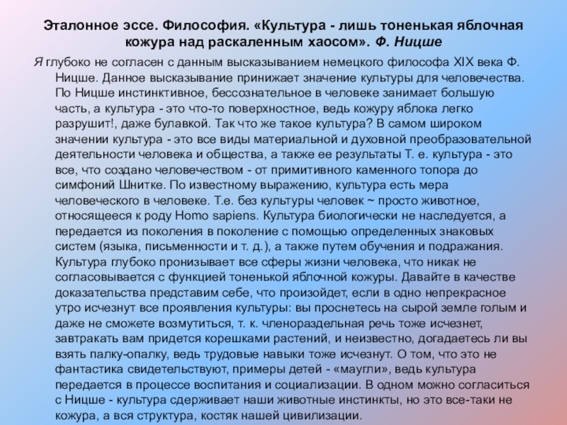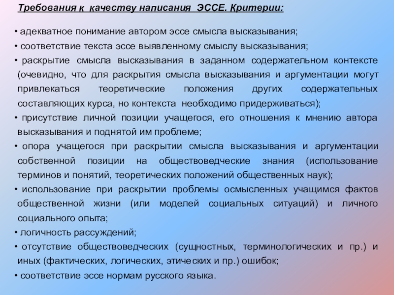 Эссе должно показать, что автор знает и осмысленно использует теоретические понятия, термины, обобщения, мировоззренческие идеи.