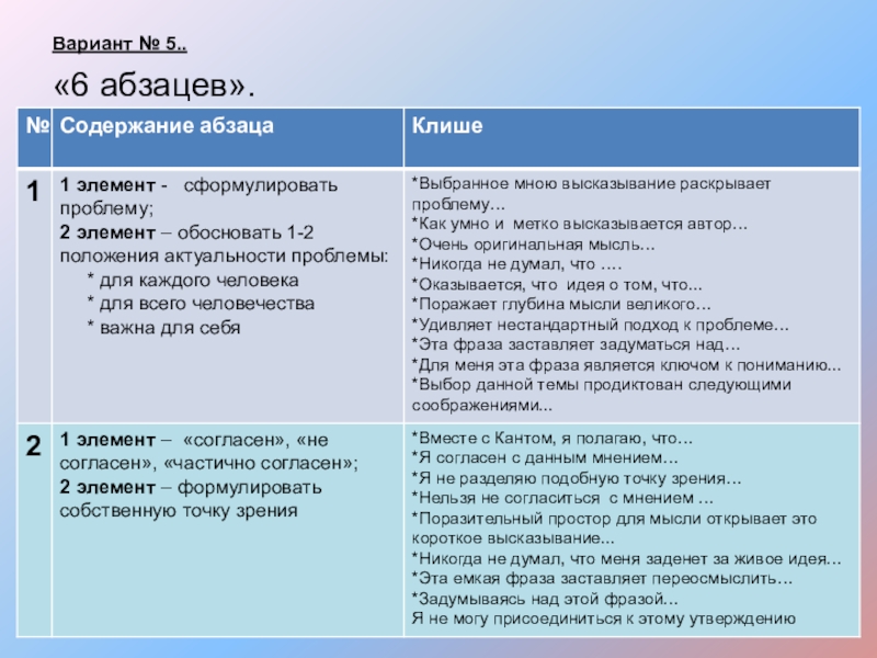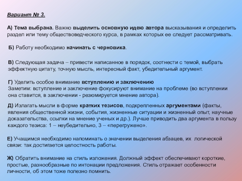 4. Выбрать то высказывание (тему), которое будет отвечать нескольким требованиям: - интересно вам, вы понимаете смысл этого высказывания, по данной теме вам есть, что сказать (знаете термины, можете привести примеры, имеете личный опыт и т.д.)