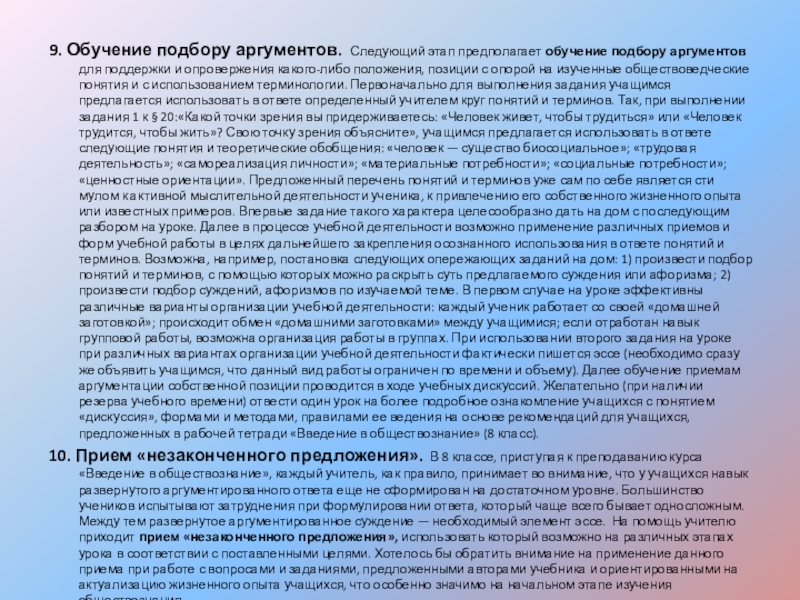 9. Для каждого аргумента отобрать факты, примеры из общественной жизни и личного социального опыта, которые убедительно обосновывают собственную позицию, и ответить на вопрос «Убедительны ли они?».