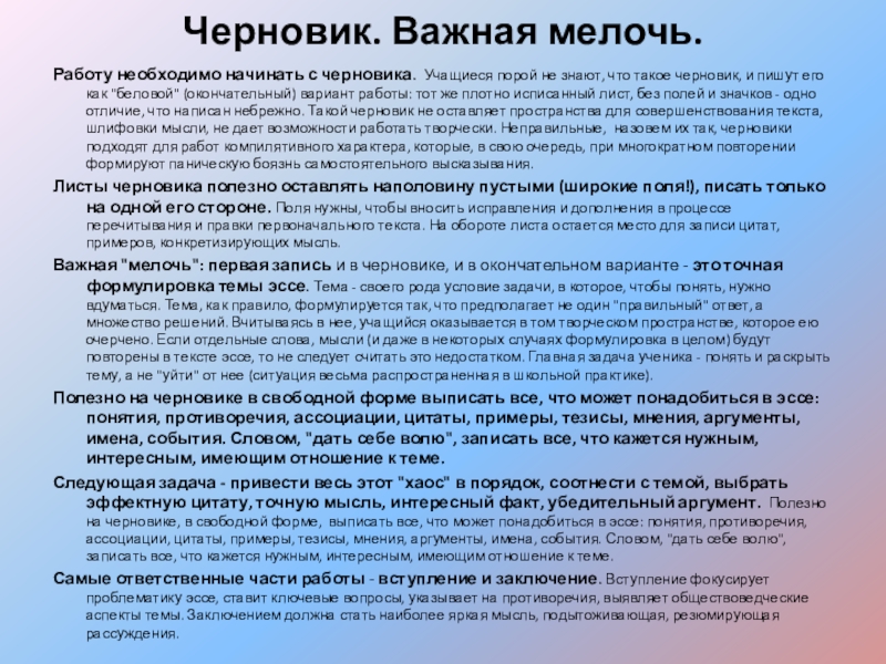 Эссе не должно содержать ничего лишнего, должно включать только ту информацию, которая необходима для раскрытия Вашей композиции, идеи.