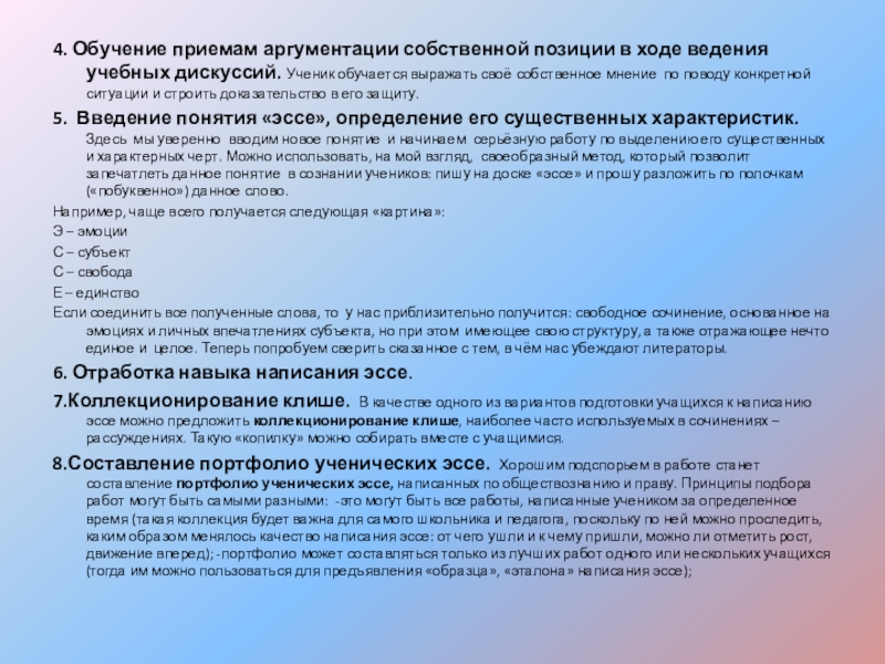 6. Цитович Т.Г.Формирование умений написания эссе на уроках обществознания // Преподавание истории и обществознания в школе.-2003.- № 7.-С. 71 -75