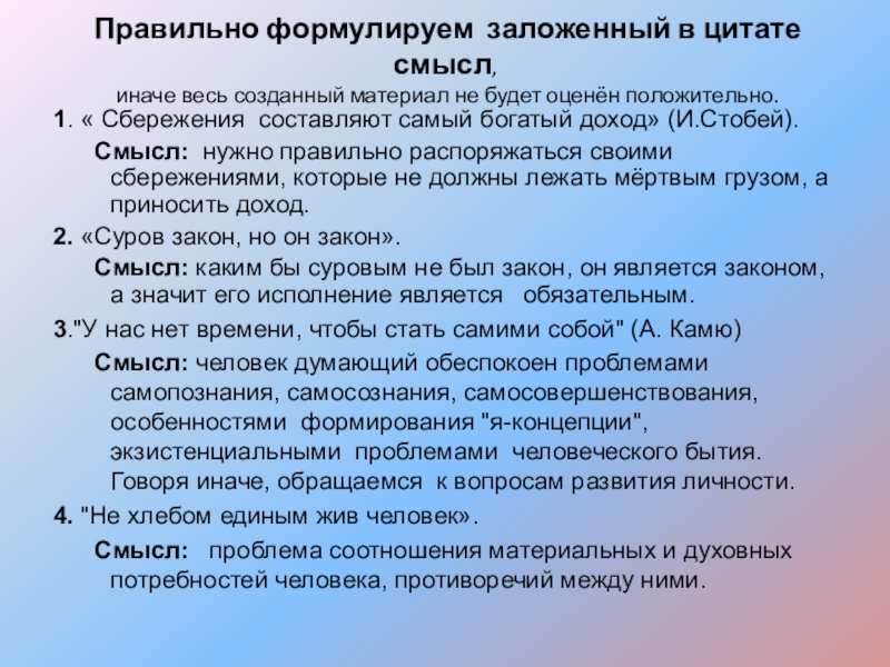 3. Определить смысл предложенных высказываний (ответить на вопрос «Что, по моему мнению, хотел сказать автор?») Скажите то же самое, но своими словами.