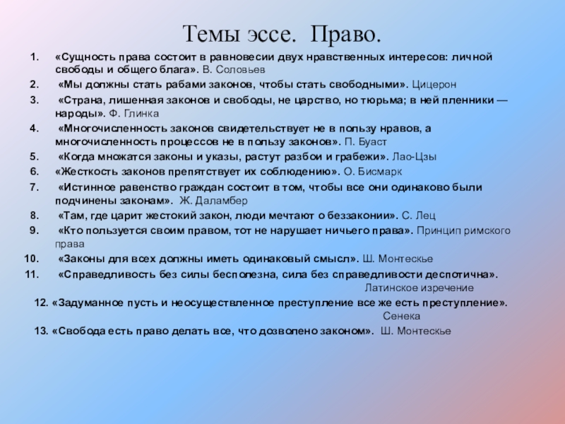 13. «Свобода есть право делать все, что дозволено законом». Ш. Монтескье