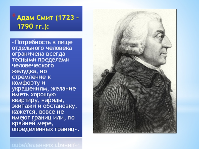 Адам Смит (1723 – 1790 гг.):«Потребность в пище отдельного человека ограничена всегда тесными пределами человеческого желудка, но